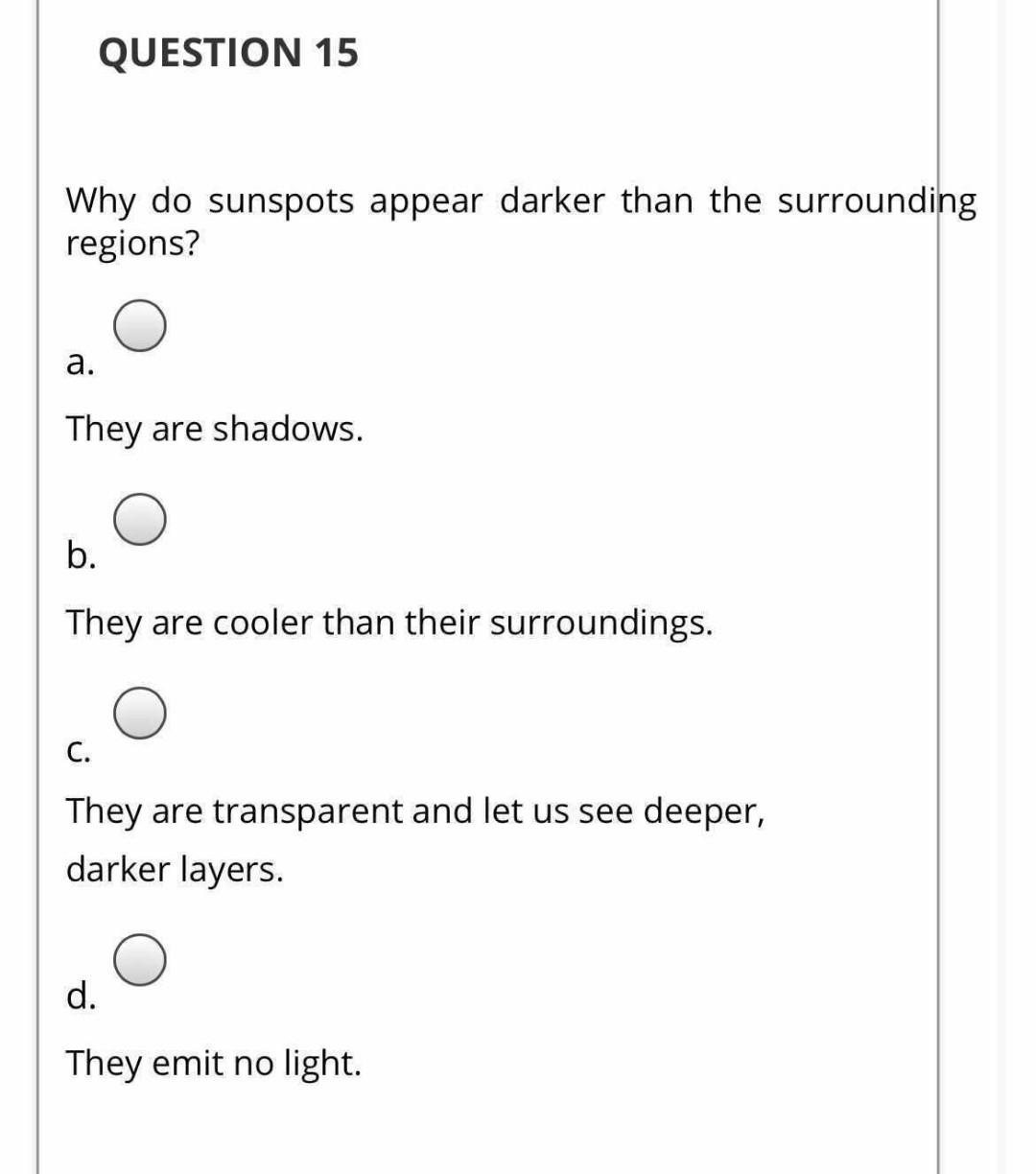 Solved Question 15 Why Do Sunspots Appear Darker Than The Chegg Com